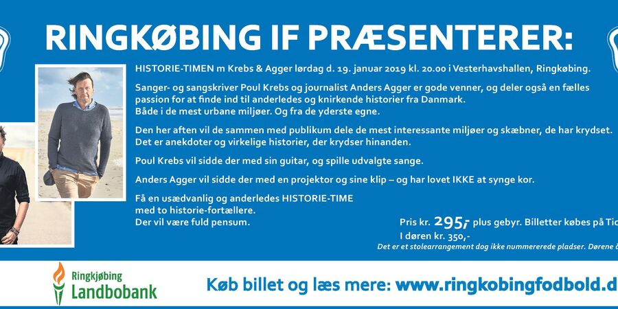 Den 19. januar næste år går Poul Krebs og Anders Agger sammen om at lave et arrangement i Vesterhavshallen kaldet ’Historie-Timen’, hvor pengene går ubeskåret til Ringkøbing IF.